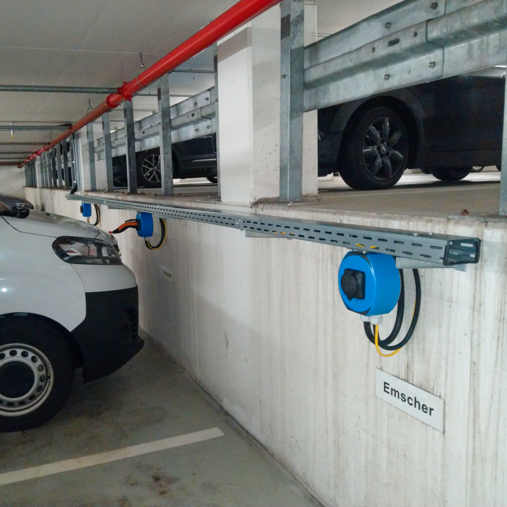 Die Ladestationen sind größtenteils wandmontiert und werden vorrangig für die Poolfahrzeuge genutzt. Mitarbeitern und Mietern werden vergünstigte Ladetarife angeboten. Ein dynamisches Lastmanagement sorgt für eine effiziente Verteilung der verfügbaren Stromkapazitäten und ermöglicht einen stabilen Betrieb auch bei hoher Auslastung.